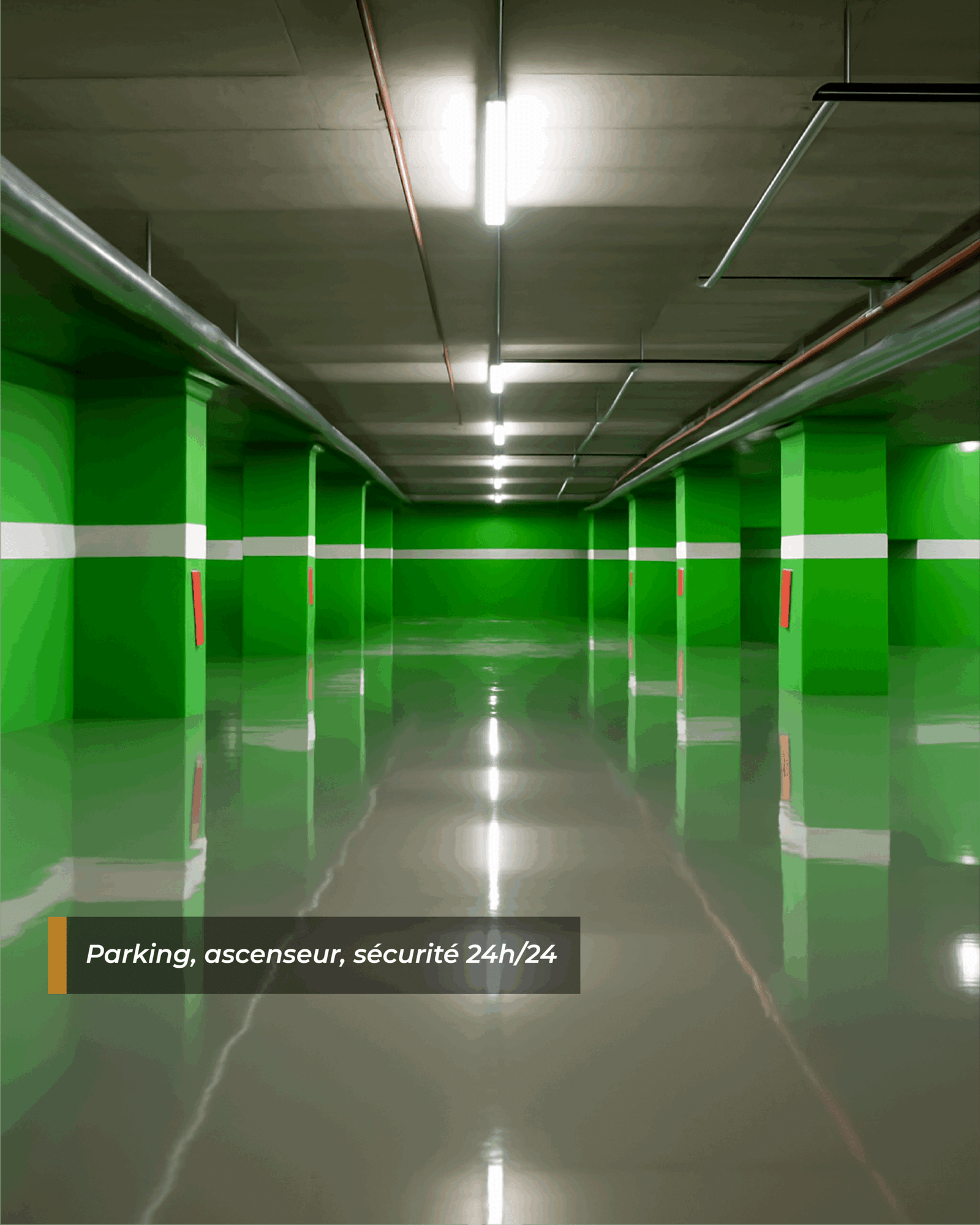 Sécurité et confort : gardiennage 24h/24, parking en sous-sol, doubles ascenseurs centraux et une aire de jeux aménagée